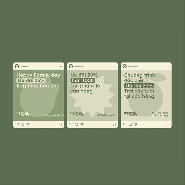 Visual Element của Bonpas Mart cũng được phát triển dựa trên những nét vẽ fulfill để xây dựng sự tương đồng trong hệ thống nhận diện. Với gam màu chủ đạo chính là xanh lá cây - màu sắc đặc trưng cho sự tươi mát, sức khỏe kết hợp với gam màu trung tính - beige giúp tạo cảm giác ấm cúng và thân thuộc.