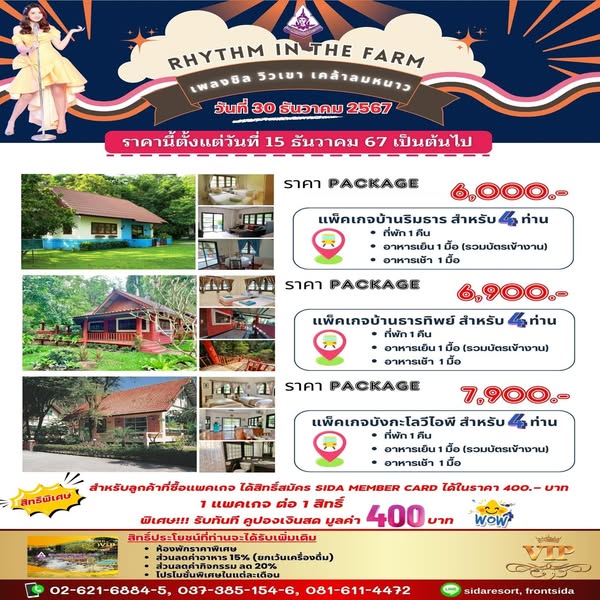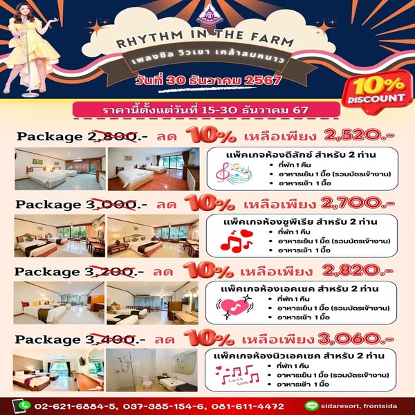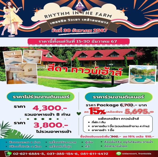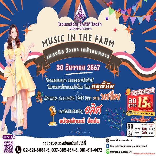 搜索关键词 Sida Resort, New Year Package, Concert, Nakhon Nayok, Family Resort, เขาใหญ่ count down, Countdown, Restaurant, Good Location优势 Free concert with famous artists,Beautiful natural scenery,Affordable package deals including accommodation and dining,Various activities and food stalls