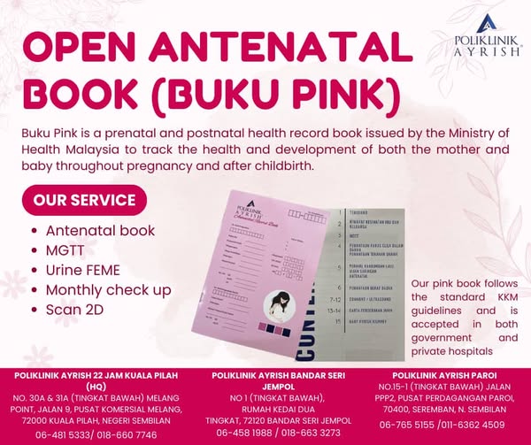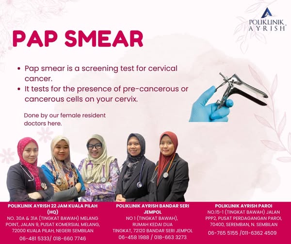 Assalamualaikum warga Seremban dan Negeri Sembilan. Jemput datang ke Poliklinik Ayrish Paroi untuk dapatkan perkhidmatan penjagaan kesihatan yang menyeluruh khusus untuk golongan wanita bersama barisan 5 orang doktor wanita kami yang berpengalaman 🙂