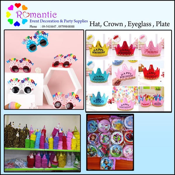 ကျွန်တော်တို့ Romantic Balloon မှာ မွေးနေ့သုံးအလှဆင်ပစ္စည်းအမျိုးမျိုး နဲ့ Party Supplies အမျိုးမျိုး ကိုတစ်နေရာတည်းမှာ လက်လီ ၊ လက္ကားဝယ်ယူရရှိနိုင်ပါတယ်ခင်ဗျာ။