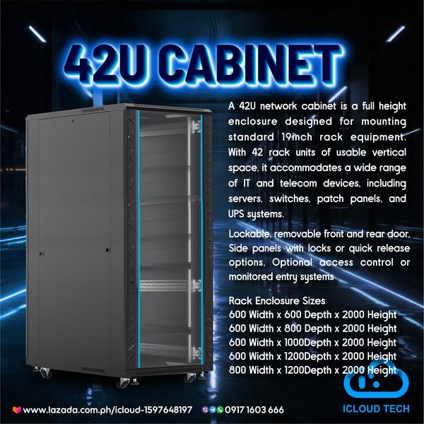 A 42U network cabinet is a full-height enclosure designed for mounting standard 19-inch rack equipment. With 42 rack units of usable vertical space, it accommodates a wide range of IT and telecom devices, including servers, switches, patch panels, and UPS systems.