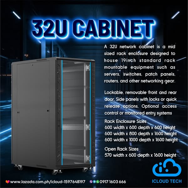 A 32U network cabinet is a mid-sized rack enclosure designed to house 19-inch standard rack-mountable equipment such as servers, switches, patch panels, routers, and other networking gear.