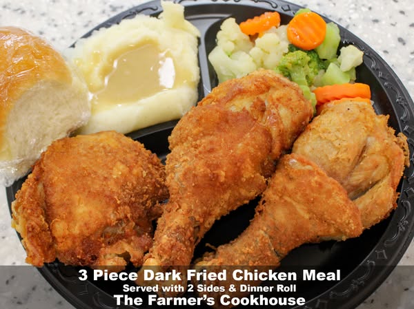 *** 3 Piece Dark Fried Chicken Meal served with 2 Sides & Dinner Roll – $10.99 Regularly $12.19