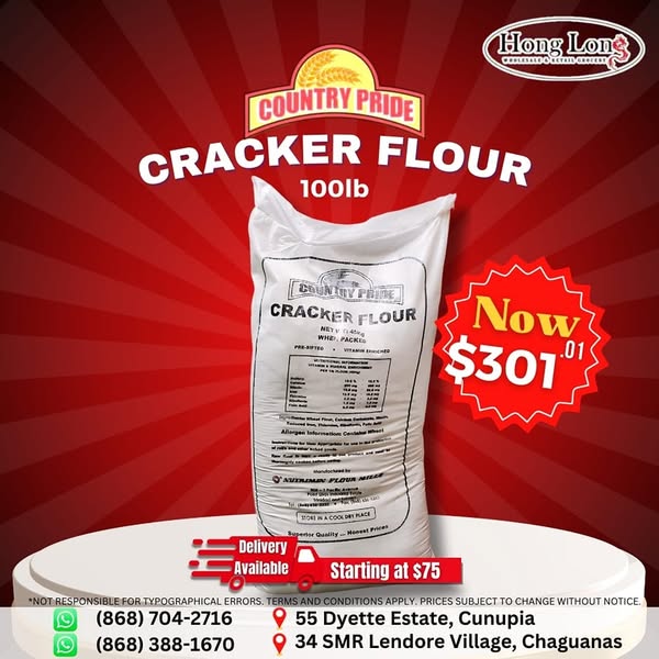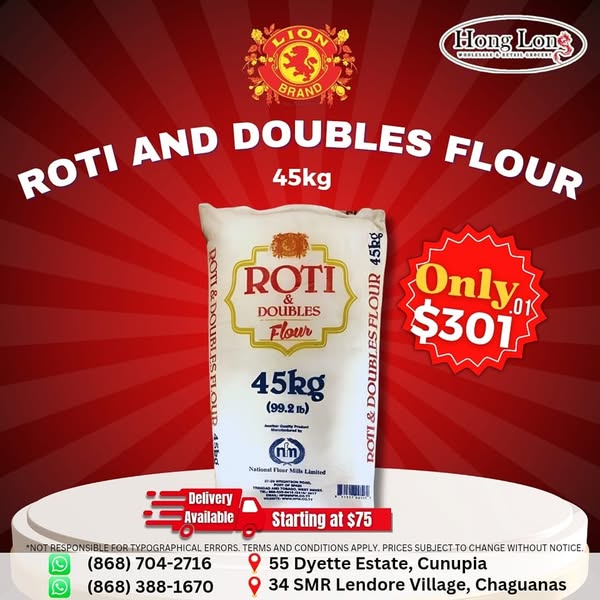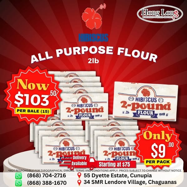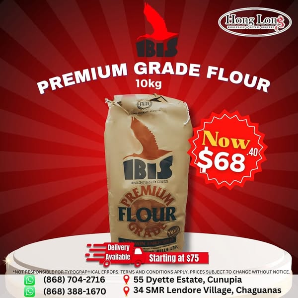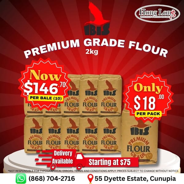搜索关键词 flour wholesale, flour retail, baking ingredient, cooking ingredient, Trinidad flour, flour delivery, cheap flour, low price, stock up, kitchen flour优势 Available for wholesale and retail,Delivery available,Long opening hours (Sunday to Sunday)