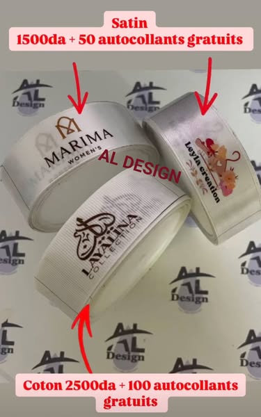 搜索关键词 personalized ribbons, custom labels, algeria fashion, clothing personalization, logo printing, satin ribbon printing, cotton ribbon printing, sticker labels, nationwide delivery algeria, unique clothing accessories优势 Customizable with logos,Includes free stickers,Available in satin and cotton,Nationwide Delivery