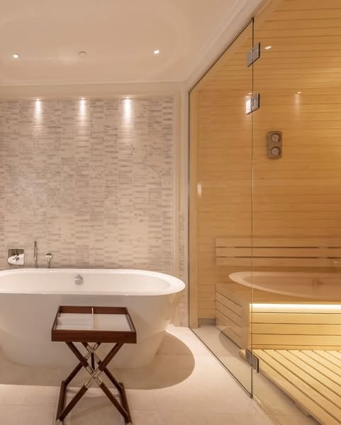 The master suite includes a fireplace and a private sauna for ultimate comfort and relaxation.