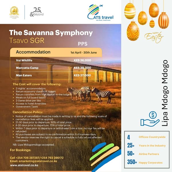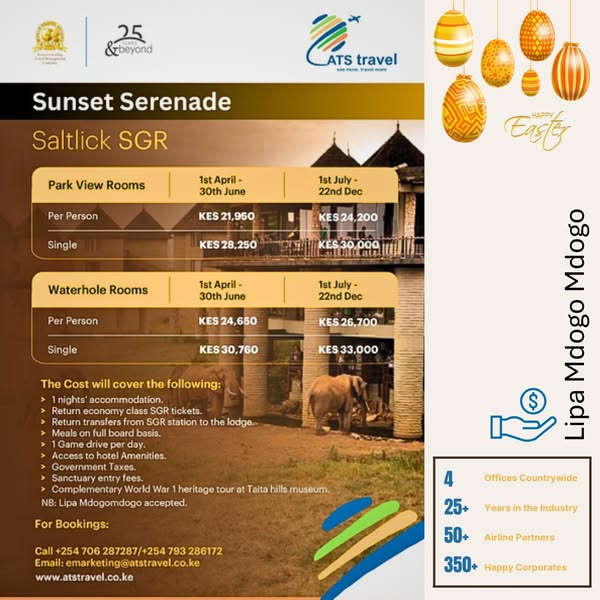 搜索关键词 Easter Travel Packages, Kenya Safari Tours, Watamu Beach Holidays, Affordable Easter Getaways, Flexible Payment Travel, Mara Safari Deals, Tsavo SGR Packages, Last Minute Easter Travel, Tembea Kenya Packages, ATS Travel Deals优势 Diverse destinations (safari, beach),Flexible payment terms (Lipa PolePole),Limited packages create urgency