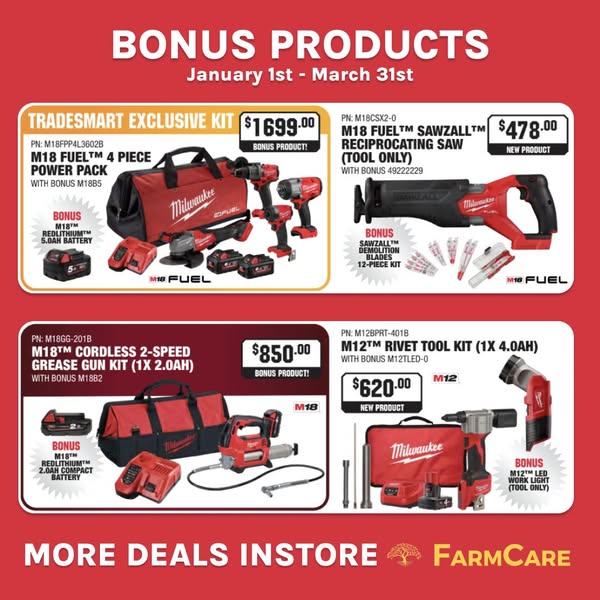 We've got a number of great deals on Milwaukee Tools all the way through to March 31st. You don't want to miss out!