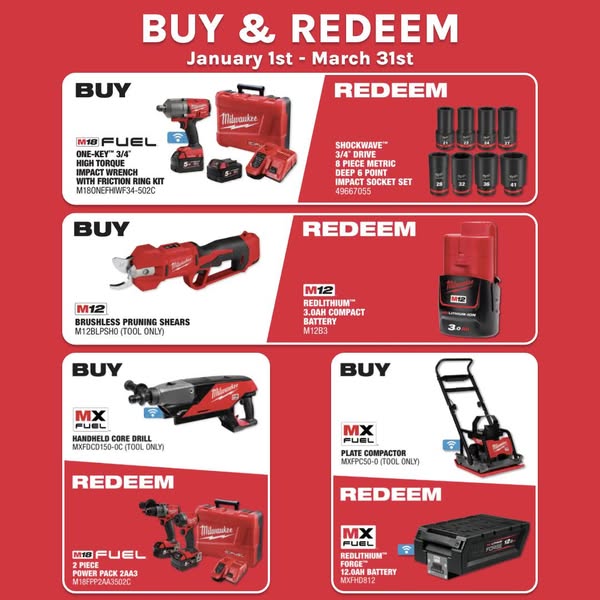 搜索关键词 Milwaukee tools, power tools, tool deals, new year deals, cordless tools, outdoor power equipment, construction tools, equipment upgrade, drill tools, plate compactors优势 Wide range of tools on sale,Deals available until March 31st,Opportunity to upgrade tools