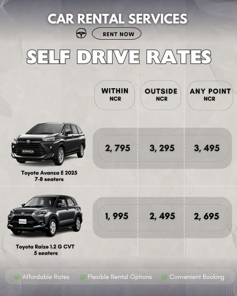 搜索关键词 self drive rentals, quezon city car, affordable car rental, clean car rentals, reliable car rentals, daily car rental, weekly car rental, monthly car rental, Avanza Raize rental, car rental discount优势 Exclusive Discounts for First 5 Bookings,Affordable Rates,No Hidden Fees,Clean, Reliable, and Well-Maintained Units,Daily, Weekly, or Monthly Rentals