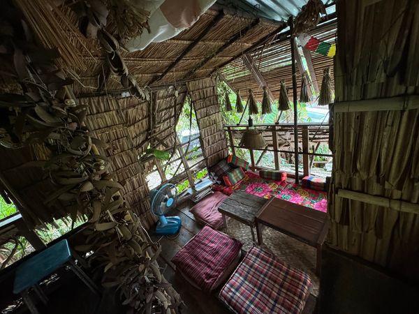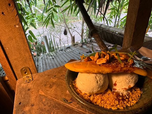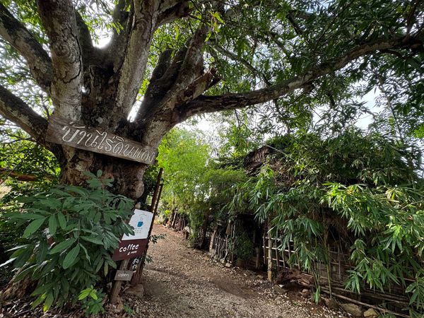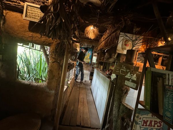 One of the most intriguing cafes I have ever been to. Looking for it following Google Maps, I almost missed it and would have just gone back to Bangkok. It was like a treasure hunt looking for this simple yet fascinating café. It looked like it had been stitched together with trees, straw, wood, mud, bricks and everything from the rural vicinity. Do not be fooled by its unworldly beaten down appearance. Entering the low wooden doors hidden amongst vegetation, one enters a rather trippy world filled with Hindu inspired artwork amidst a kaleidoscope of wooden structures holding the place up. There are tiny cozy corners here and there where a couple could sit to enjoy the desserts conjured up by the friendly owner. We had a very traditional homemade Thai bread like thing served with 2 balls of ice cream. We sat upstairs where there are seating sections that can accommodate a little bit more than just a couple. I was told the owner does fortune telling too if one is interested. Red Soil Hut opened about 2 years ago and remains a highly elusive and exclusive place to visit. The owner told me he likes to travel. Loves to visit India to bring back ingredients which he infuses into the items served. It is best to call and check if the place is open, it was quite lucky of us to be able to visit. This café, in the vicinity of Khao Yai, is not far off the main Route 2 in the direction of Bangkok. It was like we were in a tiny wonderland of some sort.