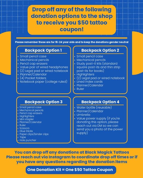 📚 We’re collecting school supplies to help students start strong. Bring in a Backpack Option from our donation list and receive a $50 tattoo coupon as our thank-you! You may bring in more than 1 for multiple coupons!