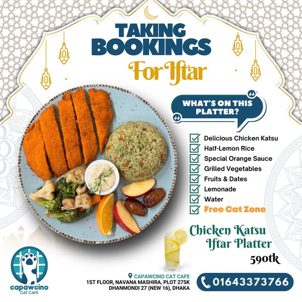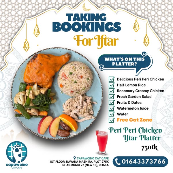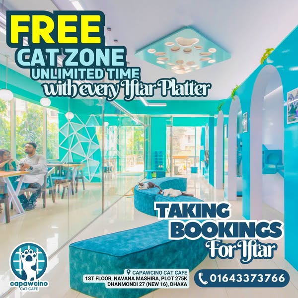 搜索关键词 Iftar with cats, Ramadan Dhaka, Cat cafe Dhaka, Dhaka Iftar offer, Capawcino Cat Cafe, Free cat zone entry, Iftar platter promotion, Dhaka cafe promotion, Ramadan special offer, Cat lover Dhaka优势 Free unlimited Cat Zone entry with Iftar Platter purchase,Unique dining experience with rescue cats,Suitable for Iftar parties, family gatherings, and more