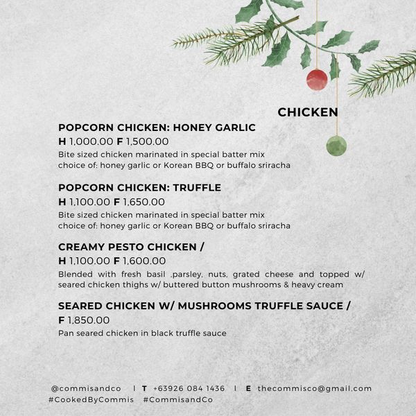 搜索关键词 holiday food, christmas catering, new year food, party trays Bacolod, Bacolod food delivery, Commis & Co menu, stainless steel trays, holiday season 2024, premium dishes, local Bacolod food优势 Convenient holiday catering solution,Stainless steel trays (first in Bacolod),Various batch times to choose from,Premium dishes
