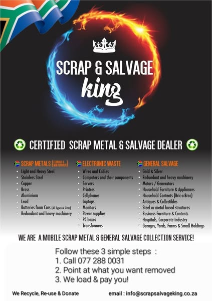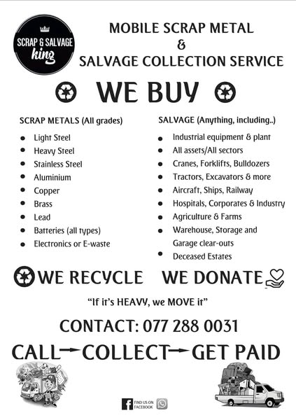 Are scrap metal, salvage, and junk items taking up valuable space, physically and mentally? We solve these niggling problems. At the same time we promote environmentally responsible practices through sustainable recycling and disposal solutions. For more information, please contact us at 077 288 0031 or email info@scrapsalvageking.co.za We offer a platform for buying and selling your scrap metal and salvage - pre-owned items and abandoned assets from all sectors - homes, business, corporates, agriculture and government. Our services cater to diverse purchasing and selling requirements for each client. Additionally, we provide efficient junk removal assistance. We Recycle, Up-cycle, re-use and Donate. *Please note that our website