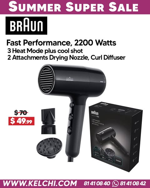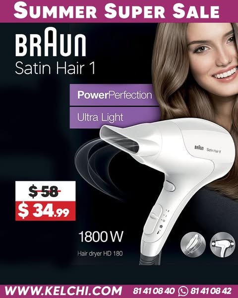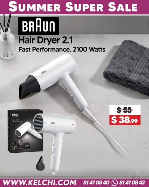 搜索关键词 summer sale, hair dryer, hair straightener, beauty products, limited time offer, kelchi beauty, Lebanon deals, hair styling tools, Braun products, warranty offer优势 Significant discount (up to 60% OFF),1-year warranty,Easy to purchase (Shop Now link),Customer support via WhatsApp
