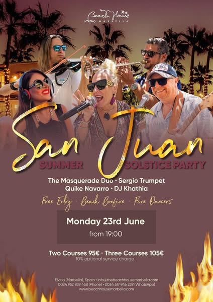 搜索关键词 San Juan Marbella, Beach House party, Summer Solstice event, June 23rd celebration, Live fire show, Beachfront restaurant, Spain summer event, Exclusive event, Luxury party, Marbella nightlife优势 Live fire show,Beachfront location,Celebration of summer solstice
