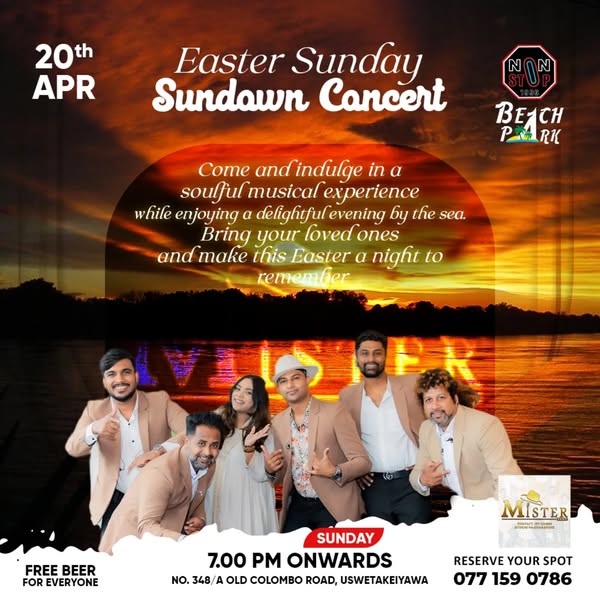 搜索关键词 Easter Sunday Buffet, Family Lunch, Live Music, Nonstop Beach Park, Free Beer Offer, Uswetakeiyawa Event, Festive Dining, Easter Celebration, Sundown Concert, Weekend Entertainment优势 Delicious buffet lunch with seasonal favorites,Festive atmosphere,Live music and free beer,Family-friendly event