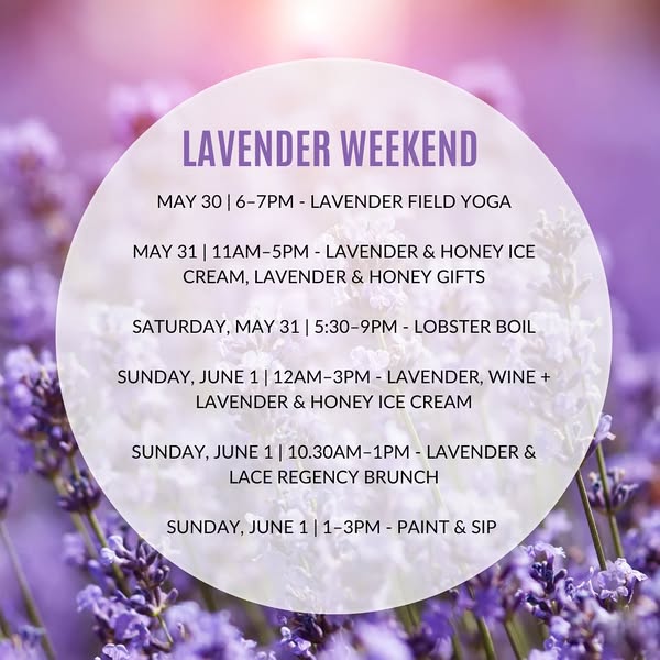 #LavenderWeekend #VineyardEvents #LiveMusicAndWine #LobsterBoil #BridgertonBrunch #PaintAndSip #LavenderYoga #SummerAtTheVineyard #TipTopTrio #SoulOnaRoll #WeekendPlans #WineCountryVibes