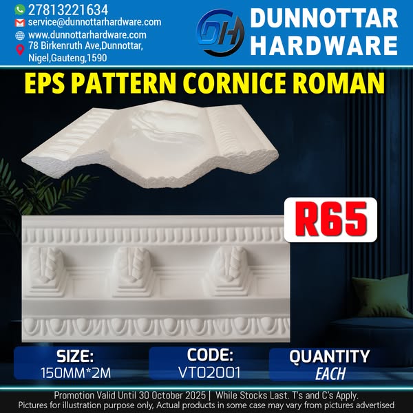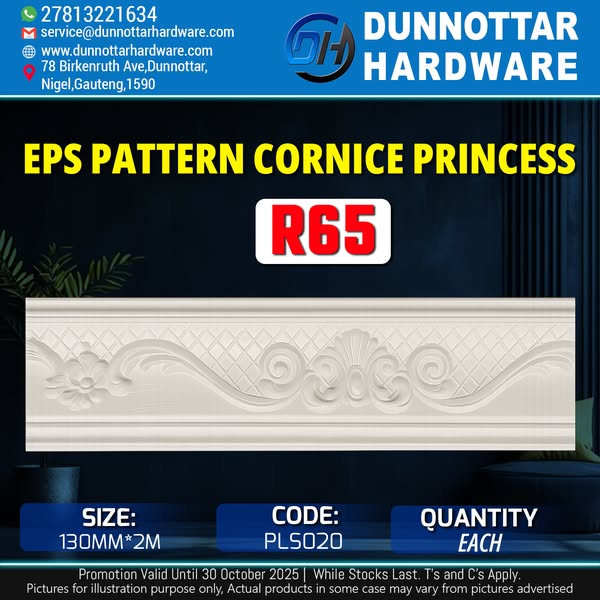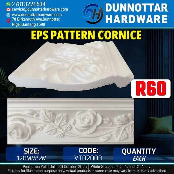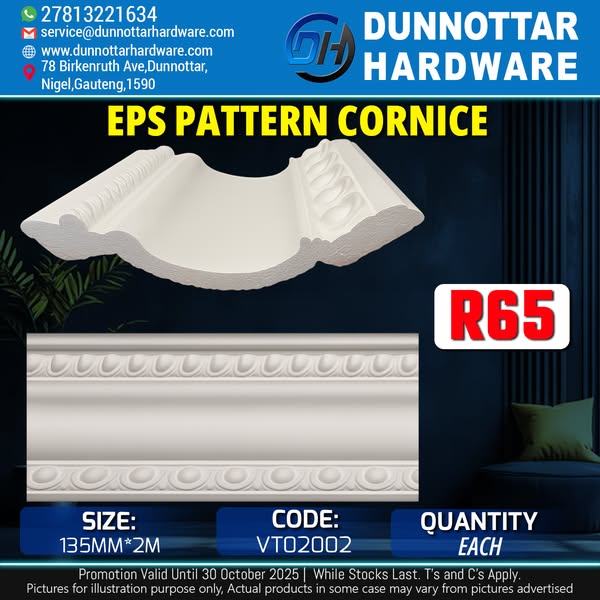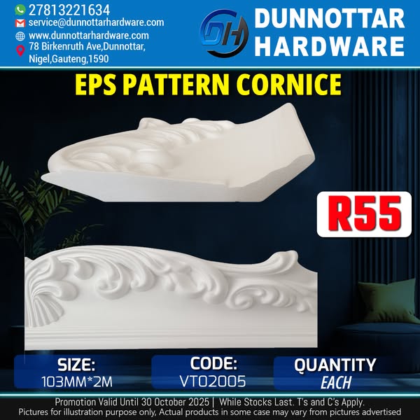 Get an EPS Pattern Cornice (Size: 103mm x 2m, Code: VT02005) for just R55 each. Stylish curve design to enhance your space!