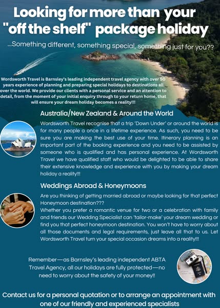 Wordsworth Travel Barnsley is Barnsley's leading independent travel agency with over 50 years' experience of planning and preparing holidays and continuing to provide a 'complete personal holiday planning service'.