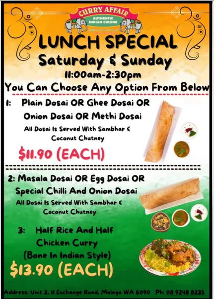 搜索关键词 Curry Affair, Lunch Specials, Malaga Restaurant, Indian Food, Affordable Lunch, Western Australia Food, Meat Combos, Veg Combos, Chicken Curry, Chicken Biryani优势 Affordable price,Variety of options including meat and vegetarian,Convenient hours