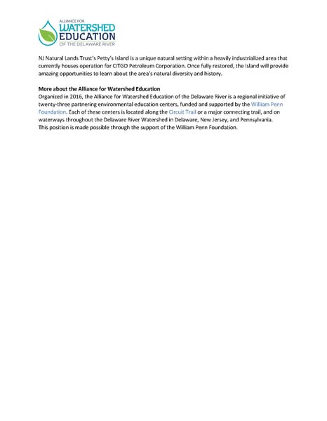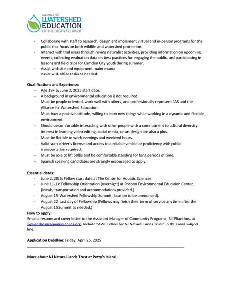 NJ Natural Lands Trust (NJNLT), a member of the Alliance for Watershed Education (AWE), is seeking to hire a Fellow from Camden, or the surrounding area, to help connect with local community members around protecting the Delaware River and its waterways.