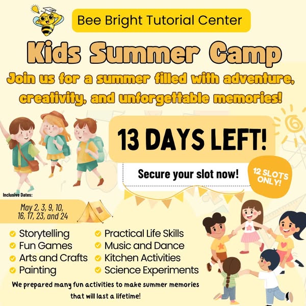 ⏳ 𝐎𝐧𝐥𝐲 𝟐𝟎 𝐝𝐚𝐲𝐬 𝐥𝐞𝐟𝐭! Join 𝗕𝗲𝗲 𝗕𝗿𝗶𝗴𝗵𝘁 𝗧𝘂𝘁𝗼𝗿𝗶𝗮𝗹 𝗖𝗲𝗻𝘁𝗲𝗿’𝘀 𝗞𝗶𝗱𝘀 𝗦𝘂𝗺𝗺𝗲𝗿 𝗖𝗮𝗺𝗽 — a fun, engaging, and educational adventure for kids 𝗮𝗴𝗲𝘀 𝟰-𝟳!
