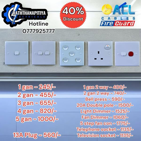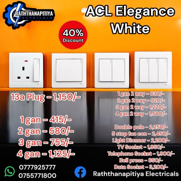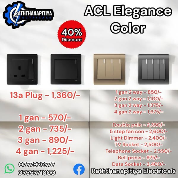 搜索关键词 electrical appliances, lowest price, sri lanka, whatsapp price, google maps, raththanapitiya electricals, ACL Electric, Kelani Cables, KDK fans, ceiling fan优势 Lowest Prices,Wide Range of Products,Easy Contact via Phone & Whatsapp,Google Maps Location