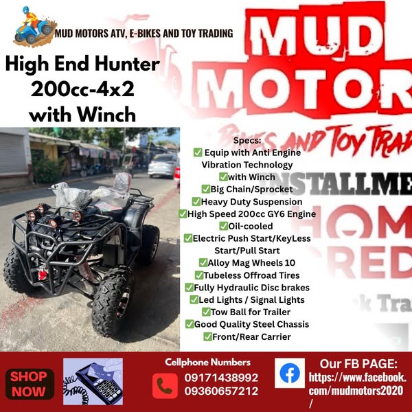 搜索关键词 Adult ATV, Adult UTV, Electric Bikes, Kids Ride-Ons, Mud Motors, Santiago City, Credit Card Installment, Home Credit, Recreational Vehicles优势 Wide selection of ATVs, UTVs, and electric bikes,Cheapest prices compared to mall SRP,Installment options available,Cash-on-delivery service,Free delivery around Santiago City