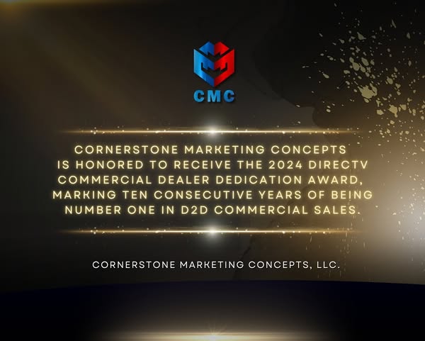 Cornerstone Marketing Concepts is honored to receive the 2024 DIRECTV Commercial Dealer Dedication Award, marking 10 consecutive years of being Number 1 in D2D Commercial Sales.
