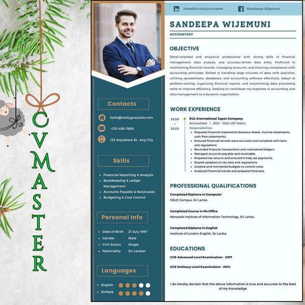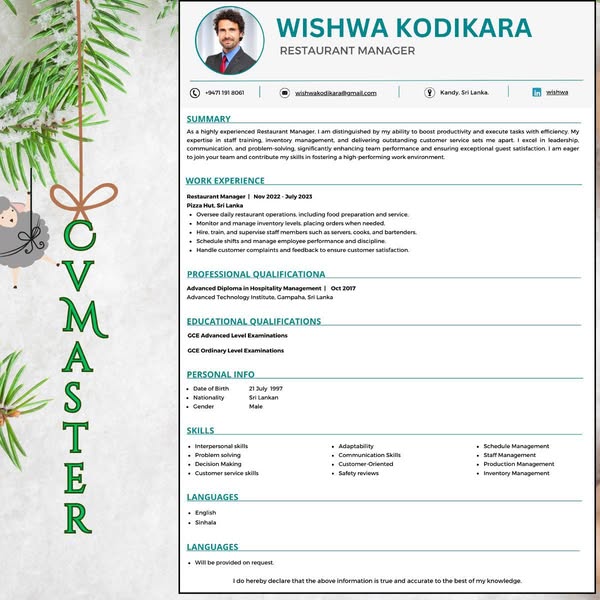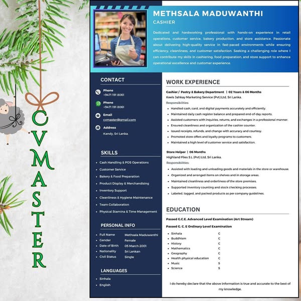 👉 CV Master ආයතනයෙන් නිර්මාණය කරන Professional CV එකක තියෙන විශේෂත්වය තමයි, ඔබ රැකියාව අපේක්ෂා කරන ක්ෂේත්රය හෝ ආයතනය ඉලක්ක කරගෙන ඔයාගේ Experience and Qualification, Keywords භාවිත කරමින්, ඔයාගේ Skills (කුසලතා)සහ Talent එක CV එක තුළින් ඉස්මතු කරලා පෙන්වන එක.