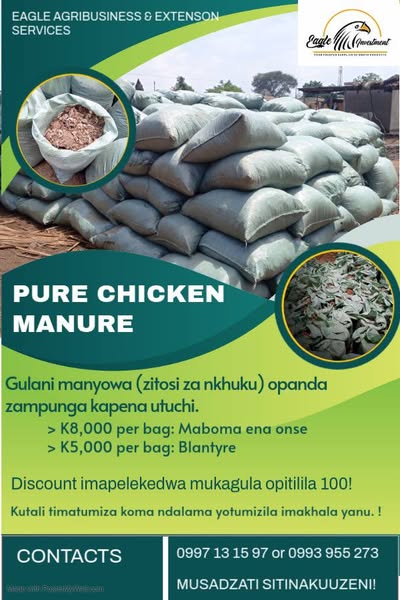 搜索关键词 chicken manure fertilizer, agriculture fertilizer, Malawi fertilizer, cheap fertilizer, organic fertilizer, Lilongwe fertilizer, Blantyre fertilizer, agriculture manure, chicken manure price, Eagle Agribusiness优势 Pure, no rice husks or sawdust,Price discount for bulk purchase (over 100 bags),Wide availability across multiple locations