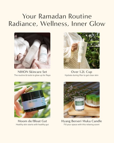 Brighten skin with NIHON Brightening Face Creme & repair with Tripeptide Barrier Recovery Essence. Stay hydrated with the 1.2L OVER Cup & ease bloating with MOOM Health De/Bloat. Relax with HYANG Studio’s calming candle & enjoy a mess-free routine with NIHON’s headband & wristbands!