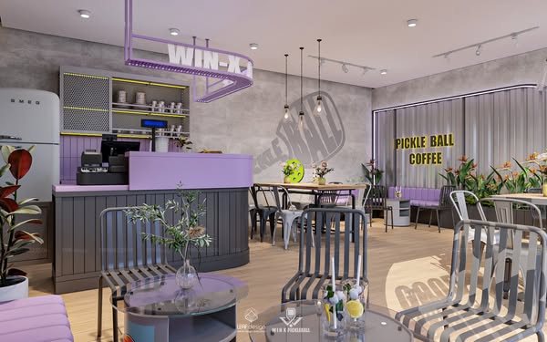 搜索关键词 interior design, coffee shop design, Pickleball coffee, lilac purple design, LEAF DESIGN, commercial interior design优势 Unique Lilac Purple Color Scheme,Creative Use of Raw Materials,Located Near Pickleball Court,Appeals to active, design-conscious individuals.