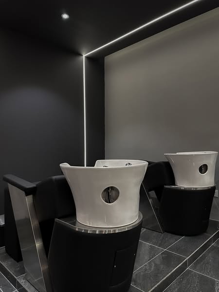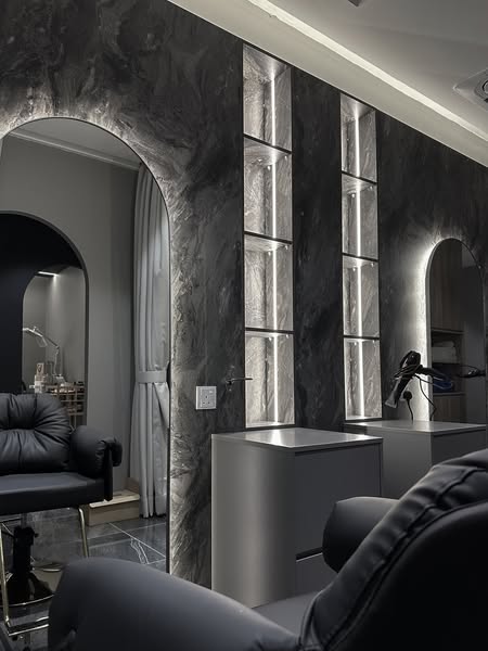 Marble finishes, black accents, and bold design choices come together to create a space that’s both luxurious and effortlessly sleek. The contrast of rich, deep tones and polished surfaces sets a sophisticated, calming atmosphere that elevates every moment. Each detail—from the sleek polished floors to the dark, rich tones—has been carefully curated to create a serene yet dramatic atmosphere. It’s not just about the hair—it’s about immersing yourself in an experience where design and luxury collide.