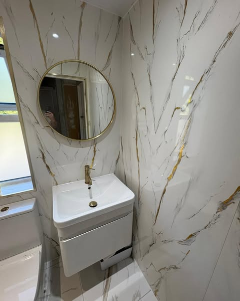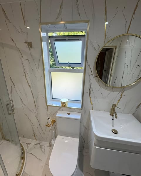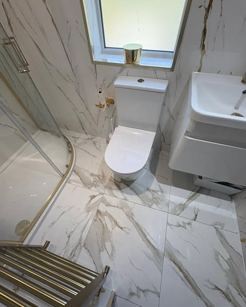But the real magic is in the details! ✨ The luxurious marble white with gold accent cladding boards and matching floor tiles create a sophisticated backdrop for the gleaming gold accents. A sleek gold-framed curved shower enclosure houses a luxurious gold rain head shower and a convenient recessed shelf. A matching gold heated towel rail adds a touch of warmth and elegance. Outside the shower, a modern white floating vanity unit with a stylish gold tap and a close-coupled toilet to complete the look. We even lowered the ceiling and installed spotlights for a brighter, more inviting atmosphere, further enhanced by the round gold LED mirror. And let’s not forget the elegant gold trim around the window and door, tying all the design elements together perfectly! What element of this bathroom remodel catches your eye the most? Tell us in the comments! 👇