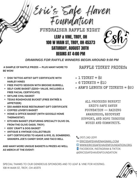 搜索关键词 Eric's Safe Haven, Fundraiser Raffle, Charity Event, Hickory River Smokehouse, Troy Ohio, Recovery Support, Community Engagement, Awareness Through Music, Donate for Charity, Local Fundraising优势 Supports a good cause,Offers multiple ways to participate (raffle, dining),Provides entertainment and community engagement