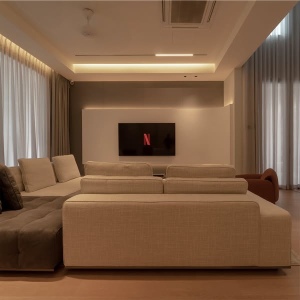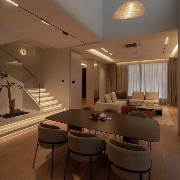 灯光设计通过嵌入式灯带与精致吊灯实现多层次光影过渡,既强化了空间氛围,又满足多场景需求。从隐藏式收纳的简洁美感到家具选择的舒适实用,每一处细节都展现了功能与美学的精致平衡,为居住者提供宁静且艺术化的生活体验。