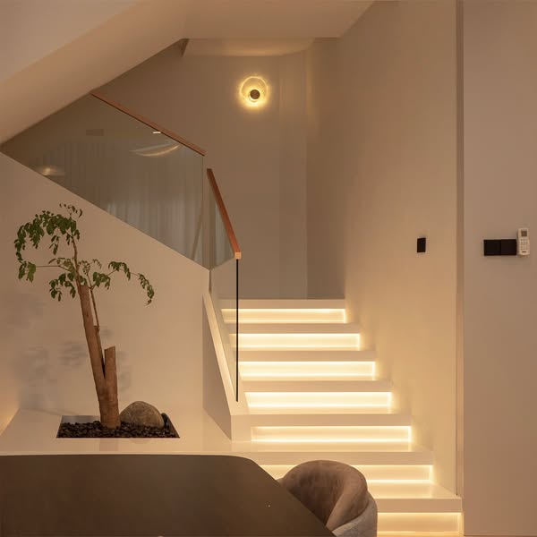 Recessed light strips and pendant lights provide multi-layered illumination, creating a welcoming atmosphere and catering to different needs. The thoughtful storage and comfortable furniture strike a perfect balance between practicality and aesthetics, offering a peaceful, artfully curated living space.