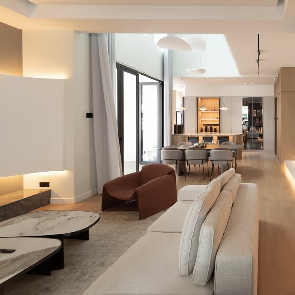 This open-plan design features a fluid layout and plenty of natural light, creating a bright and airy atmosphere. Large sliding glass doors blur the boundaries between indoor and outdoor, while the furniture arrangement complements the flow, defining areas and ensuring daily functionality.