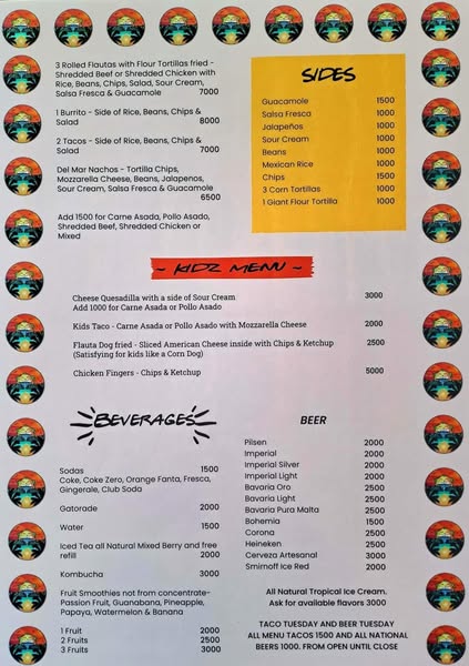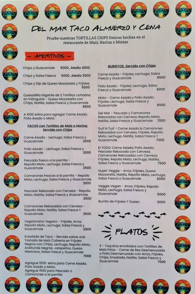 搜索关键词 Taco Tuesday, Dominical Costa Rica, Fresh Tacos, Local Seafood Tacos, Burrito Plate, Quesadillas, Del Mar Nachos, Credit Card Accepted, SINPE accepted, Spanish English Menu优势 Affordable Tacos on Tuesdays,Wide variety of taco fillings (meat, vegetarian, vegan),Fresh, locally sourced seafood options,Accepts credit card and SINPE,Menu in Spanish and English