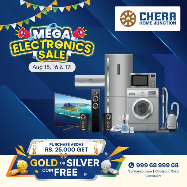 #CheraHomeJunction #MegaElectronicsSale #FreedomFurnitureSale #IndependenceDaySale #CoimbatoreShopping #GoldCoinOffer #SilverCoinOffer #FestivalDeals #HomeNeeds