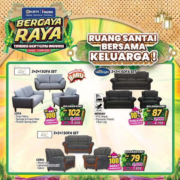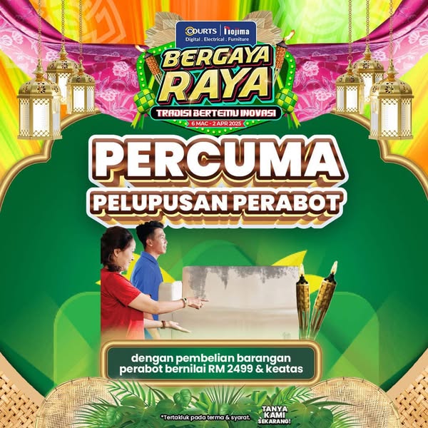 搜索关键词 Courts Malaysia, Raya Promotion, Furniture Discount, Electronics Sale, Buy Now Pay Later, Kulim Promotion, Free Gifts, Online Shopping, Monthly Installments, Home Appliances优势 Free gifts with purchase (powerbank, earbuds, TV bracket, HDMI cable),Discounts on furniture up to RM600,Easy payment options (monthly installments, buy now pay later),Online application available