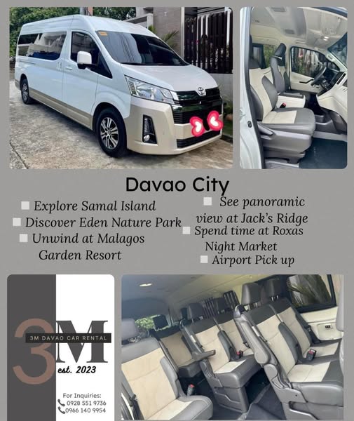 搜索关键词 Davao Van Rental, Mindanao Tours, Airport Transfer Davao, Family Outing Van, Business Trip Transport, Comfortable Van Service, 14 Seater Van, GL Grandia Tourer, Point to Point Transfer, Safe Van Hire优势 14 Seater Capacity,Comfortable Leather Seats,Charging Ports in each row,Clean and Sanitized Vans,Professional & Friendly Drivers,Point to Point Service