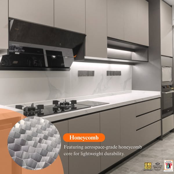 Crafted with 𝗜𝗡𝗗𝗨𝗦𝗧𝗥𝗜𝗔𝗟-𝗚𝗥𝗔𝗗𝗘 𝗔𝗟𝗨𝗠𝗜𝗡𝗜𝗨𝗠 and reinforced by a 𝗹𝗶𝗴𝗵𝘁𝘄𝗲𝗶𝗴𝗵𝘁 𝗵𝗼𝗻𝗲𝘆𝗰𝗼𝗺𝗯 𝗰𝗼𝗿𝗲, every cabinet is engineered for 𝗦𝗧𝗥𝗘𝗡𝗚𝗧𝗛, 𝗦𝗧𝗔𝗕𝗜𝗟𝗜𝗧𝗬 & 𝗦𝗢𝗣𝗛𝗜𝗦𝗧𝗜𝗖𝗔𝗧𝗜𝗢𝗡 — perfect for Malaysia’s humid weather and high-use kitchens.