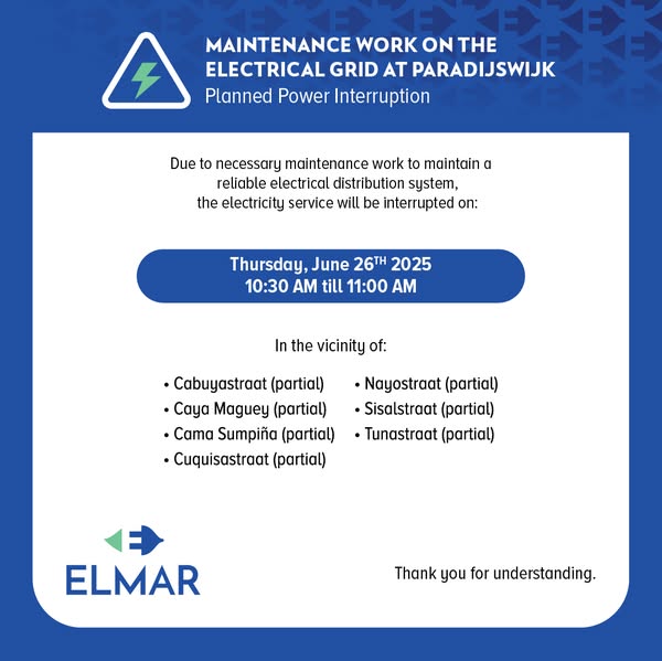 TRABOU DI MANTENCION RIBA E GRID DI CORIENTE NA PARADIJSWIJK: Pa sigui garantisa suministro di electricidad; ELMAR lo ehecuta trabou di mantencion den e area di Sisalstraat y vecindario.