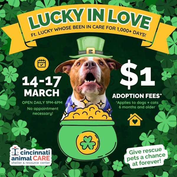 Get ready to strike gold this St. Patrick’s Day weekend with $𝟭 𝗮𝗱𝗼𝗽𝘁𝗶𝗼𝗻𝘀 𝗳𝗼𝗿 𝗮𝗹𝗹 𝗱𝗼𝗴𝘀 𝗮𝗻𝗱 𝗰𝗮𝘁𝘀 𝗼𝘃𝗲𝗿 𝟲 𝗺𝗼𝗻𝘁𝗵𝘀 𝗼𝗹𝗱 at Cincinnati Animal CARE! Give a rescue pet a second chance, and who knows—you might just get lucky and find your perfect match!