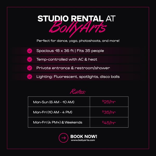Need a professional studio for rehearsals, yoga, photoshoots, or events?