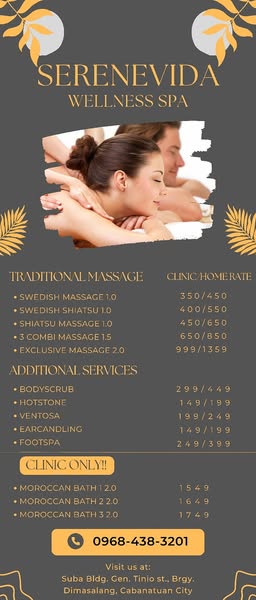 搜索关键词 Wellness Spa, Relaxation Massage, Moroccan Bath, Home Service, Cabanatuan City, Male Therapist, Female Therapist, Late Night Spa, Spa Deals, Monday Escape优势 Luxurious and relaxing experience,In-clinic or at-home/hotel service,Late hours of operation,Both male and female therapists available